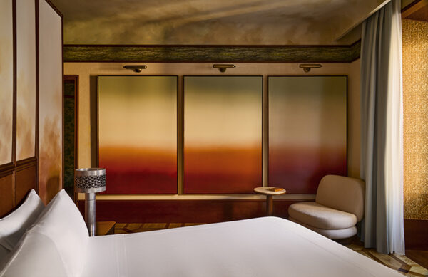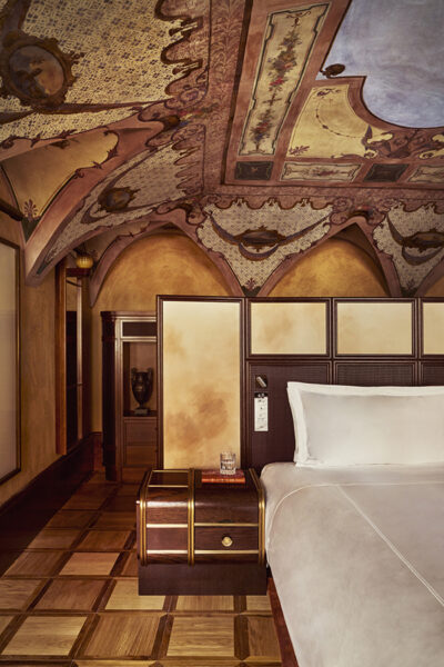 酒店共设 93 间客房与 36 间套房。受原建筑条件影响,每间客房在面积与布局上均有所不同。室内设计并未直接复刻东方快车列车,而是借鉴其比例感与细节逻辑,通过木质构件、收纳形式与连续的走廊空间,将旅行的记忆转化为适合停留的居住体验。部分客房天花以柔和的色彩描绘罗马天空,使室内与城市产生轻微而持续的联系。