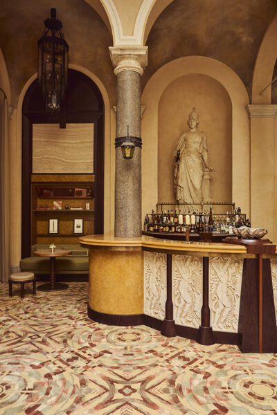 公共空间包括大堂酒吧、餐厅、屋顶空间与会议区域。La Minerva Bar 位于一层中庭,利用自然采光与原有大理石构件,营造出安静而开放的场所氛围。玻璃屋顶下,密涅瓦雕像与原始大理石立柱被完整保留,空间氛围随时间从白昼的自然光线过渡至夜晚的私密与精致。