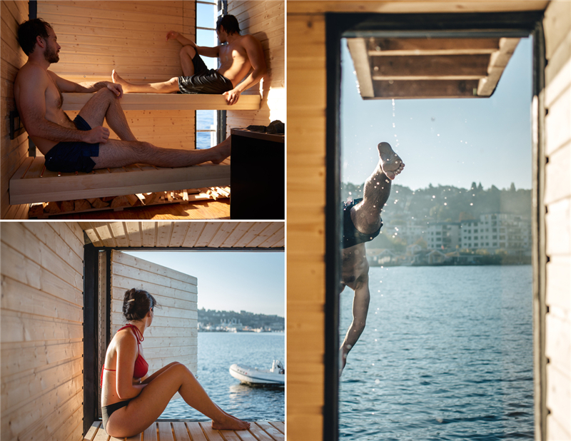 这是一个浮动的桑拿屋,是用集资来的资金建造的,它就像一艘停泊在码头的船舶,或是一个私家别墅,如果需要还可以去往开放水域。作为一个移动建筑,wa桑拿屋在这里与那些居民生活船和大型船舶社区,以及皮划艇等各种船舶融和在一起。室内是通过一个简单而高效的木材燃烧炉来加热的,整体采用了预制铝合金框架和甲板上的悬浮系统建造。它可以定时的出现在西雅图湖泊中。