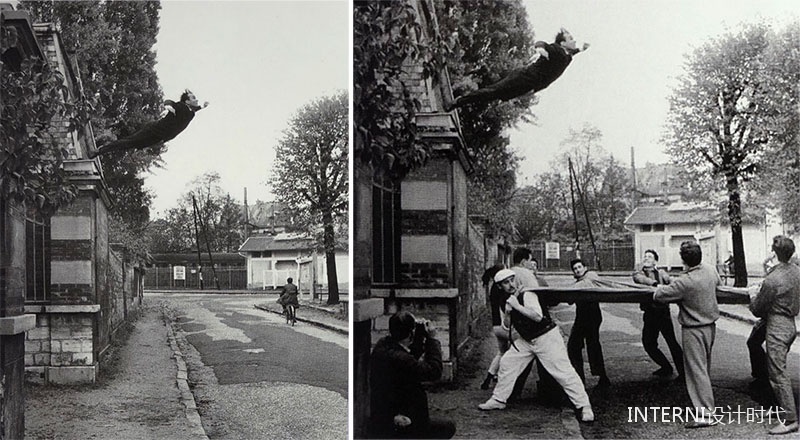 下方左图是当代艺术中非常重要的事件或照片,Yvss Klein从墙下跳来,成为行为艺术的鼻祖,名字姣《跃入虚空》或《自由落体》。之前我一直在想,他跳下来会发生什么?前两天在飞机上我看到另一张照片(下方右图),终于明白了现场的情况:下面有多人拉着一块布,跳下来的时候把艺术家接住,旁边还有摄影师在记录。其实这跟“设计”很像,我们平时看到的结果可能是左图,但其背后的工程则涉及了多人的分工协作。其最开始的灵感和最后呈现的张力是我们所需要的,中间的过程可能没人愿意看到,这就是我今天想聊的“设计中的知性和感性”。
