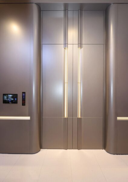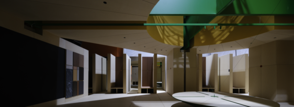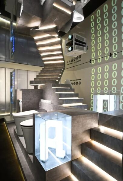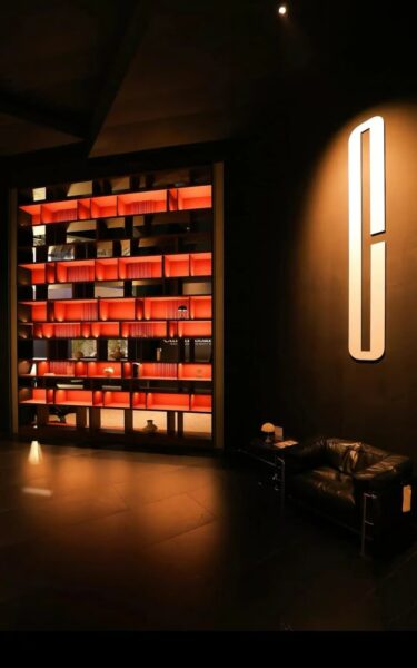 整个空间如同一场持续的视觉游戏。锐利的直线与温润的曲面相互渗透,硬质的板材在光影的雕刻下呈现出液态的诗意,而圆孔洞则成为贯穿不同材质、不同功能区域的“视觉线索”。它们让内外景象相互渗透,让细节与宏观彼此对话,在层叠交织的视线中,构建出“解构-流动-重组”的空间韵律。胡涛强调:“我们希望观者能够触摸到材料的‘温度’——不仅是物理的触感,更是情绪的共振。”这些圆孔,正是情绪的取景框,它们框选出光线的嬉戏、材质的肌理、人流的韵律,将观察本身转化为一种自由的选择,一种创作的开始。
