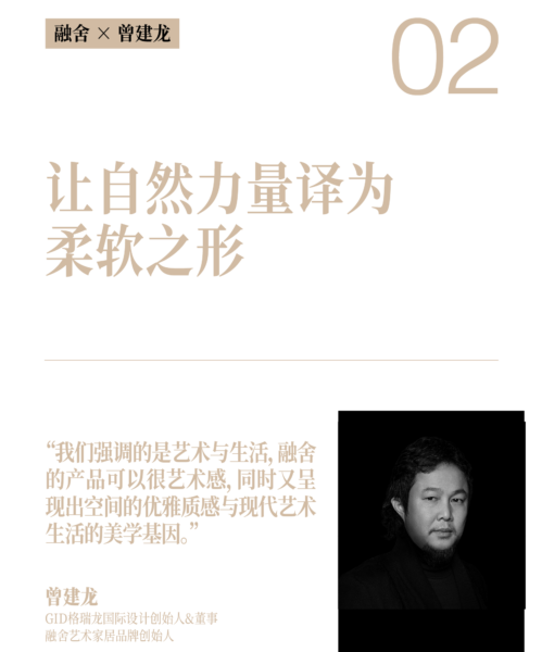 “我们强调的是艺术与生活,融舍的产品可以很艺术感,也可以呈现出空间的优雅与质感,同时又注入了现代艺术生活的美学基因。”曾建龙将这种不可见的基因,译为可触碰的生活形态。