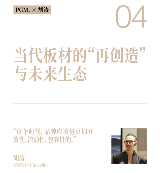 在材料的选择上,PGM.通过其六大产品体系——木纹、石纹、布纹、素色、高定与艺术系列,展现了材料作为“情绪载体”的丰富可能。无论是具有肌肤触感的表面,与光影细语的结构肌理,还是作为“色彩情绪锚点”的大地色系,都在圆孔的凝视中被重新诠释。这种对材料语言的探索,正是胡涛所说“未来还有更多维度去赋予品牌更多形象”的生动展开,也让PGM.从板材制造商,真正转向“设计解决方案的共创者”。