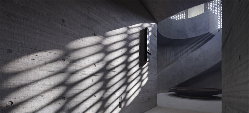 ▲ 水疗中心建筑由老的罐形储藏空间改造而来,经水泥旋转楼梯通向内部空间。