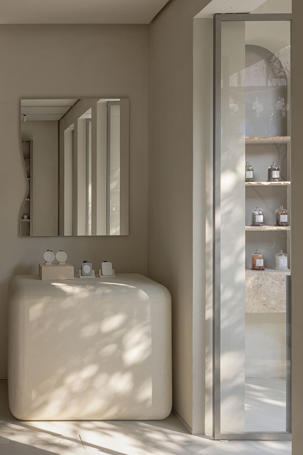 而由于产品展示的需求,更多的镜子、嵌入展示柜被置入到空间中。我们将室内众多墙面元素统一整合为墙面上的不同的“框”,并通过调整“框”的形状、大小和高低来创造各个角度所看到的不同“景”,从而实现步移景异的空间体验。将窗变成门,将门变成过道,拓宽调整门与门,窗与窗的关系,从而加强空间的层次递进,并将庭院和花园的景色透过“框景”连接,以不同的方式呈现在各个空间之中。与此同时,通过镜子这一框景元素的运用,在并不大的空间创造虚实结合的观景体验。