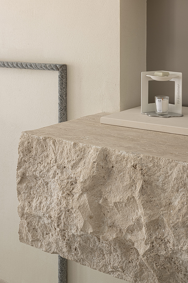 园林设计的方法同样也体现在室内材料的选择上,门梁、门槛与台面、柜体的材料选择上大量使用了用于室外的毛石,以此呼应室外的景观元素。