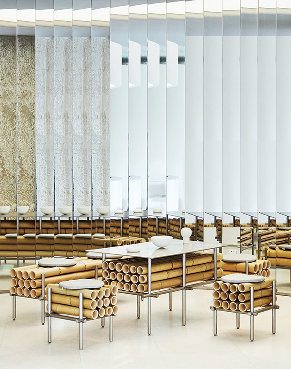 竹制家具被安排在一个隔断的空间内,设计师同样运用了材料的对立统一,来衔接传统与当代的设计语言。组合后的竹板构架在不锈钢支架上,竹板通过了传统的碳化反腐工艺处理,竹子部分的架构摒弃了常规使用胶水和钉子的固定方式,完全运用中国传统手工艺竹钉衔接。