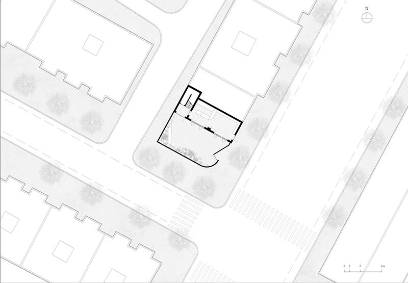 在院子的改造上我们结合了业主的三点想法:口袋公园、骑行友好和宠物友好。社区道路一侧的院墙渐次地降低,至主道路一侧院墙最矮,自然形成庭院入口。入口处为街道退让出向内的三角形空间,以相对温和的方式面向城市。院子深处的院墙维持了原有的两米高度并放置了大量的绿植,形成一个有包裹感的口袋公园。三边院墙的不同高度对应着紧邻街道由私密过渡至开放的设计特性。