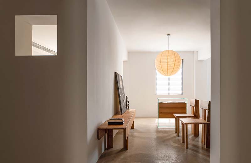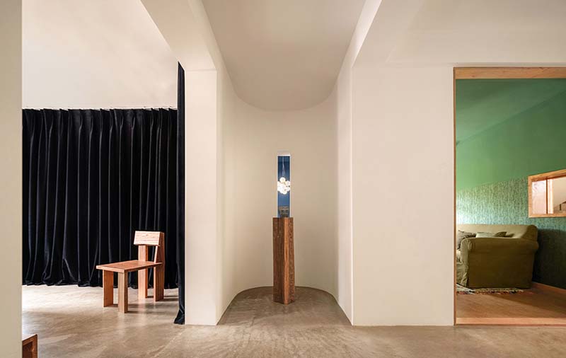 室内改造中,我们主要对隔墙进行了干预。空间中的不同隔墙上通过布置窗洞以引入光线,同时在室内起了框景作用,重构了空间内部墙顶地以及门窗的关系。墙体之间设置了壁龛,成为空间中的视觉焦点。一楼院落一侧的窗扩大成旋转移门,木质窗套作为建筑边界呈现出闭合与开放两种不同的姿态。不同的建筑边界对应着四季的气候状况,室内与室外的关系也在分割和融合间转换。在夏季,庭院成为室内空间的外延,使建筑与底层景观获得良好的连接。