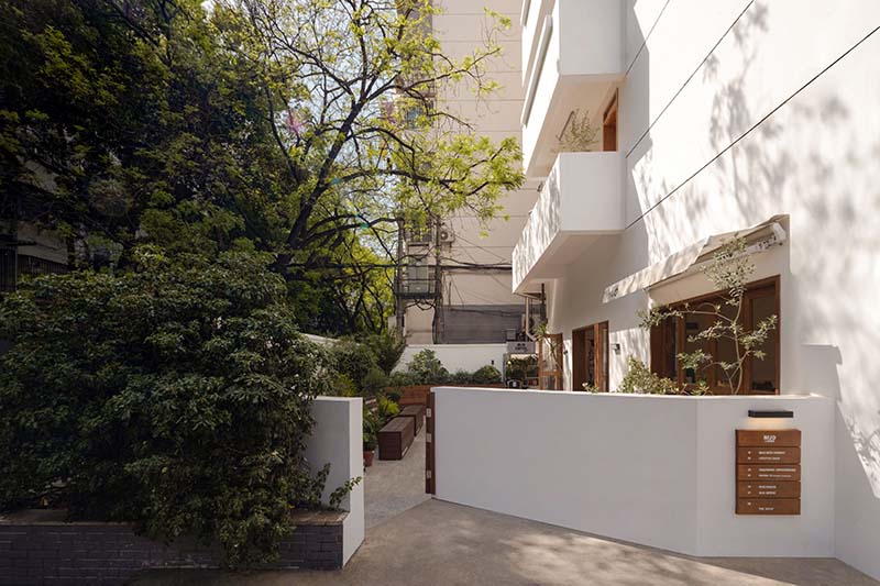 如何将其改造成为既尊重社区又保留商业空间特质是此次设计的核心思考。根据Corso Monoforte 9的启发, 我们为二条商店设计了一套由阳台与门窗形成的立面语言:将旧租客封闭的阳台恢复为打开状态,还原立面明暗交叠的丰富表情。木制门窗替换掉原有的PVC门窗,使风格更为统一。外立面整体由白色涂料覆盖,保留阳台的矩形装饰,抽象处理使建筑与临近住宅有适度的区隔。在城市尺度上,白色墙体在街道中醒目但不夸张,跟环境融为一体。我们希望通过新与旧的对话,重新激发起城市居民对他们生活区域的好奇与兴趣,从视觉和空间体验中获得新的经验。