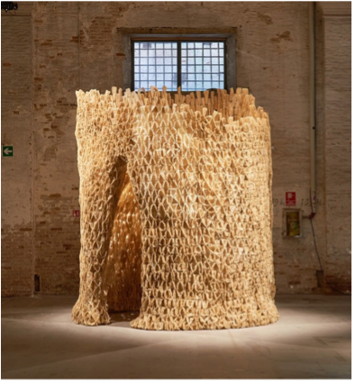对菌丝下手的设计师其实还有很多,菌丝在建筑界已经被视为大自然的天然胶水,并作为一种新型的可持续建筑材料。菌丝体根纤维与锯末或小麦鞘等其他产品一起生长,然后菌丝体分解这些材料,从而增加尺寸。菌丝体被收获并压实成砖形模具,并在温暖的环境中晾干,从而制成耐磨的砖。THE LIVING设计师事务所用这种技术创作了新的装置作品。设计师们在产品设计和建筑设计领域通过一些创新可持续的新型环保材料的应用,实现着设计的环保责任。